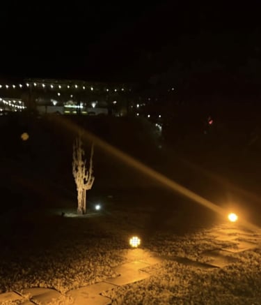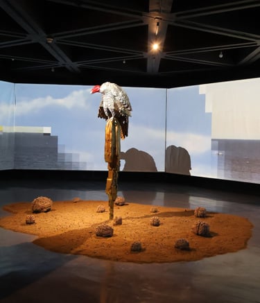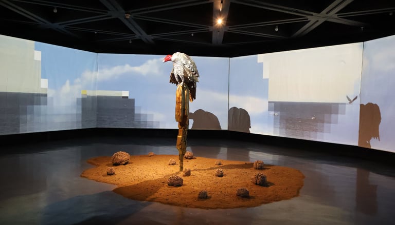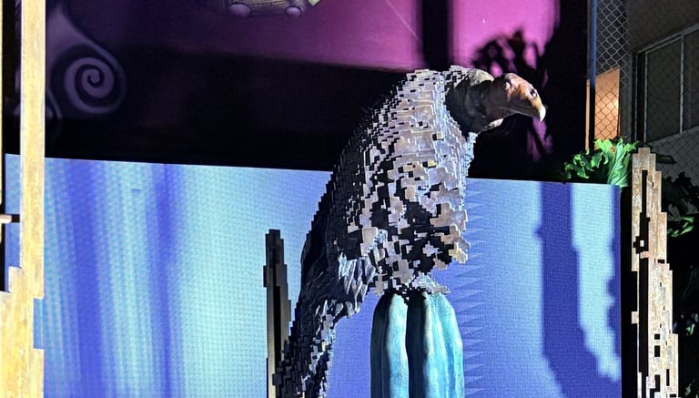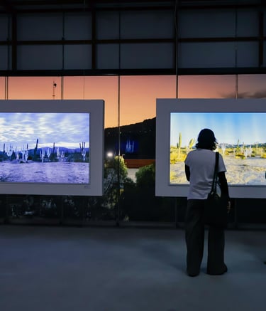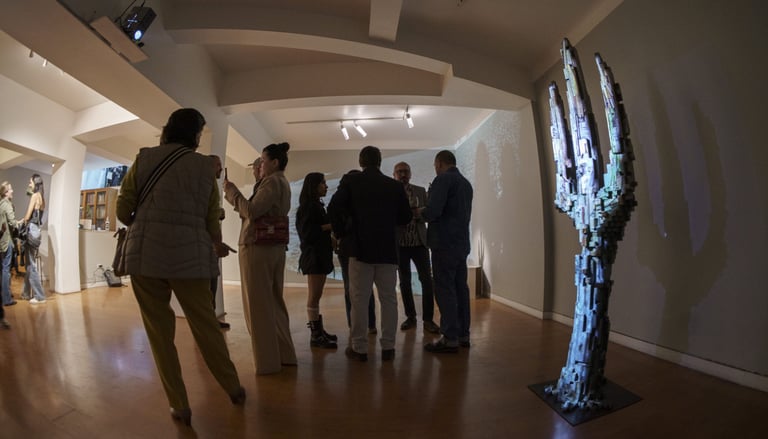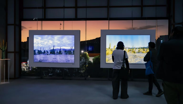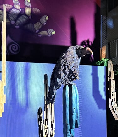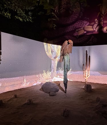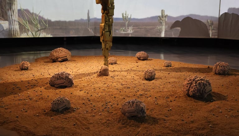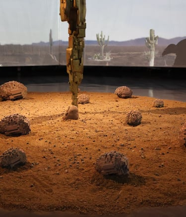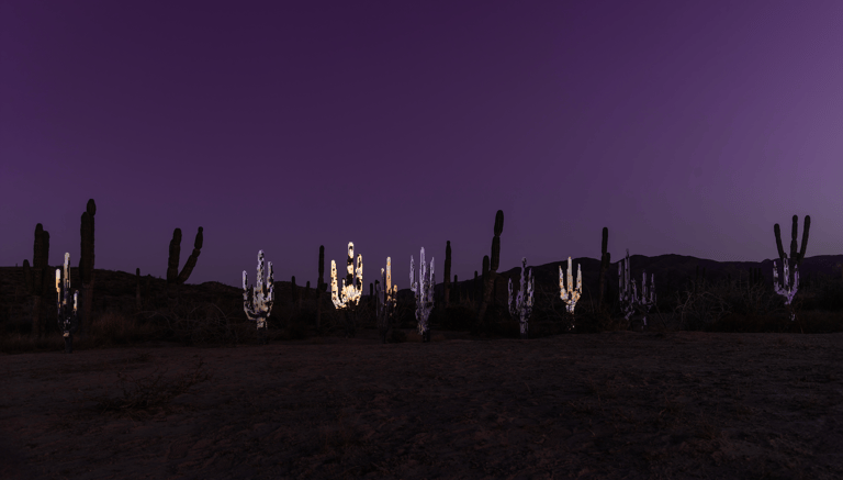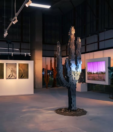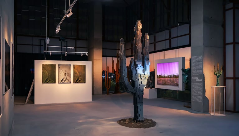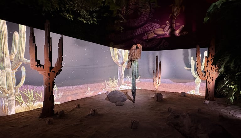 Surrounding this central form, Lozano populates the space with pixelated cacti, rocks, and a solitary deer. These elements—part landscape, part apparition—lend the installation a hypnotic rhythm. The cacti, with their obstinate resilience, anchor the work in the earthly realm. The rocks evoke the permanence of time, and the deer a fragile grace moving between worlds. In this triad, Lozano constructs a silent theology of connection: between what endures and what fades, between the sacred and the synthetic.