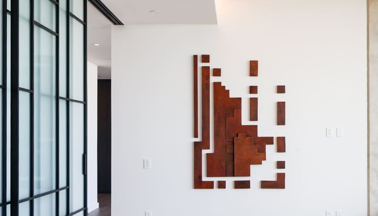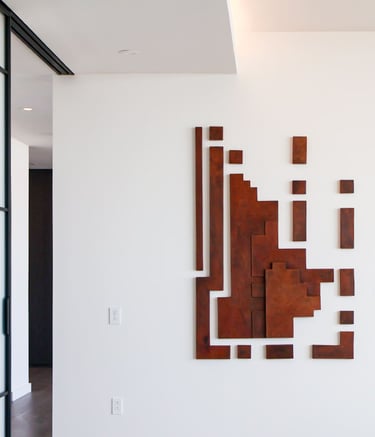Installed at the top of the tower (The Modern, Austin), his new series of works reimagines spiritual ascent as a visual and psychological experience. At the center is a mural that evokes a portal: nine concentric geometric figures expanding outward, a geometric echo of movement and time.